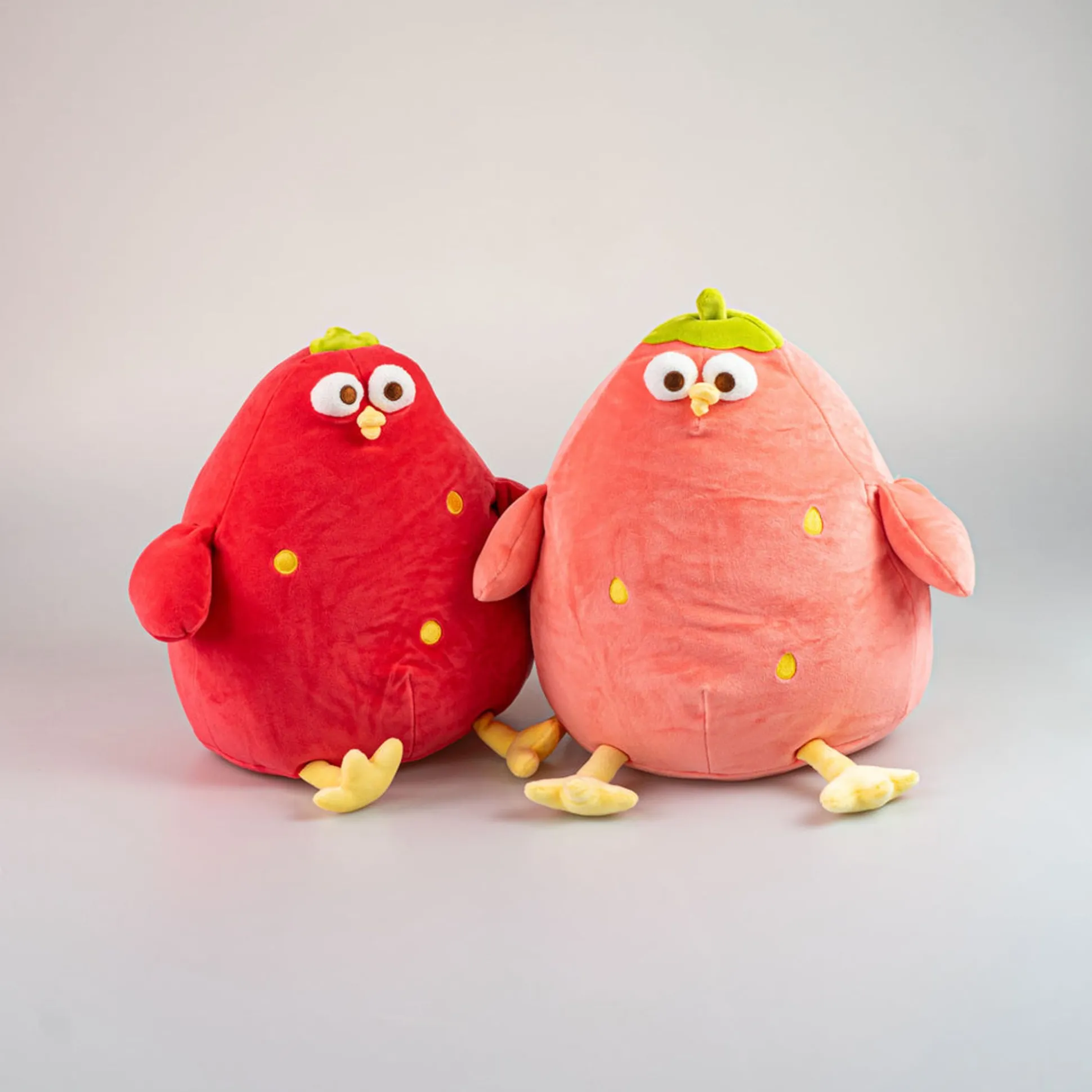 Peluche Morbido E Simpatico A Forma Di Pollo Dundun Tarvestito Da Fragola, Disponibile In Due Varianti Di Colore: Rosa Chiaro, E Color Ciliegia.