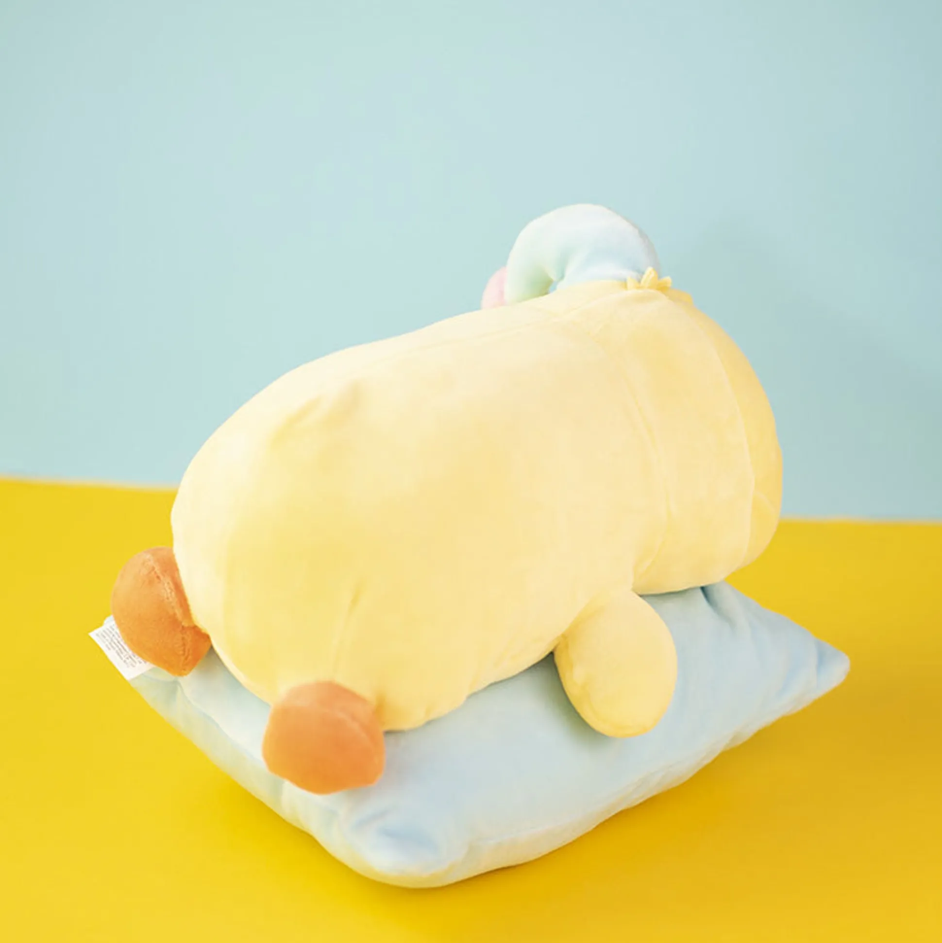 Peluche Pulcino Bibi Che Dorme Su Cuscino Azzurro Con Cappellino Lungo Azzurro.