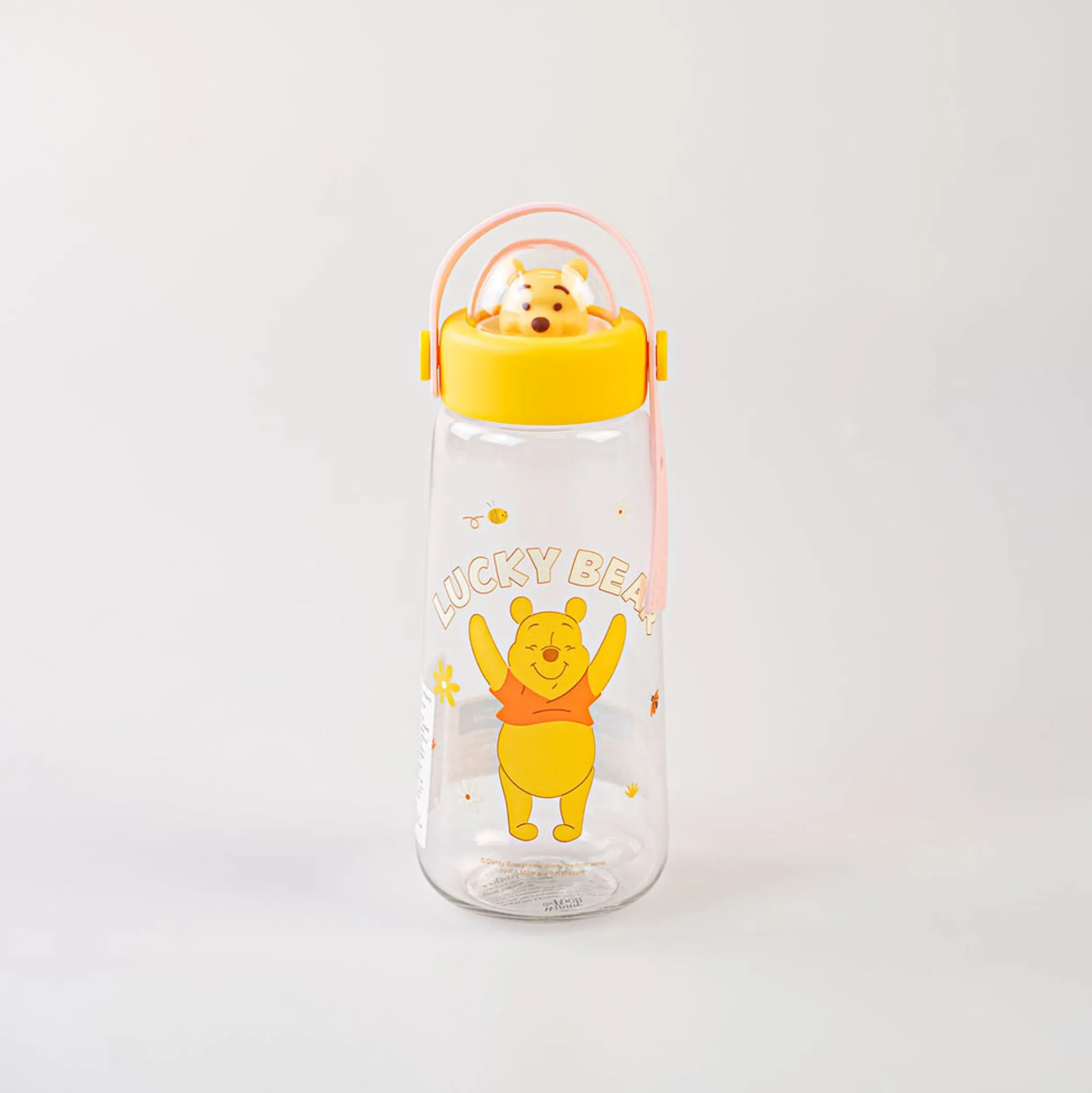 Borraccia In Plastica Trasparente Di Winnie The Pooh Della Collezione Disney, Con Scritta Lucky Bear E Manico Rosa.