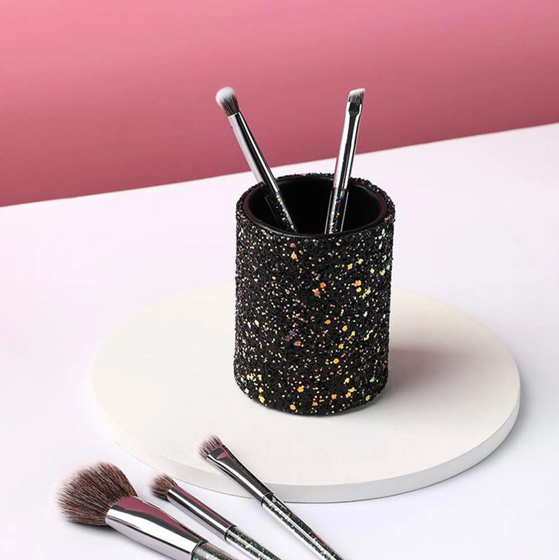 I Pennelli Sonoall’Interno Di In Un Elegante Contenitore Cilindrico Di Plastica Nera Con Glitter